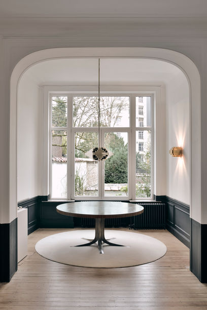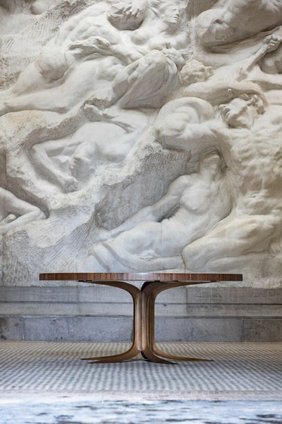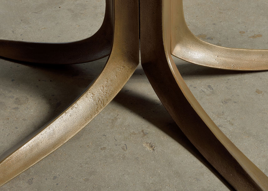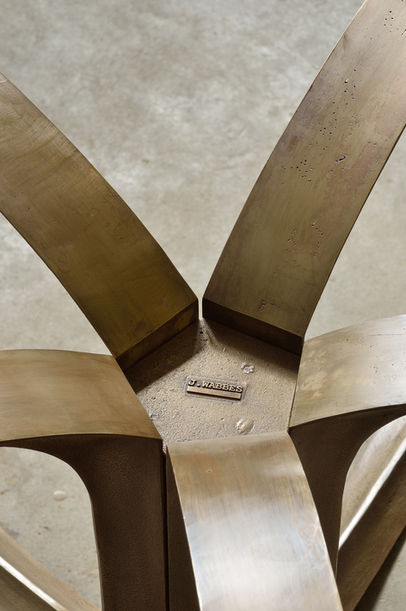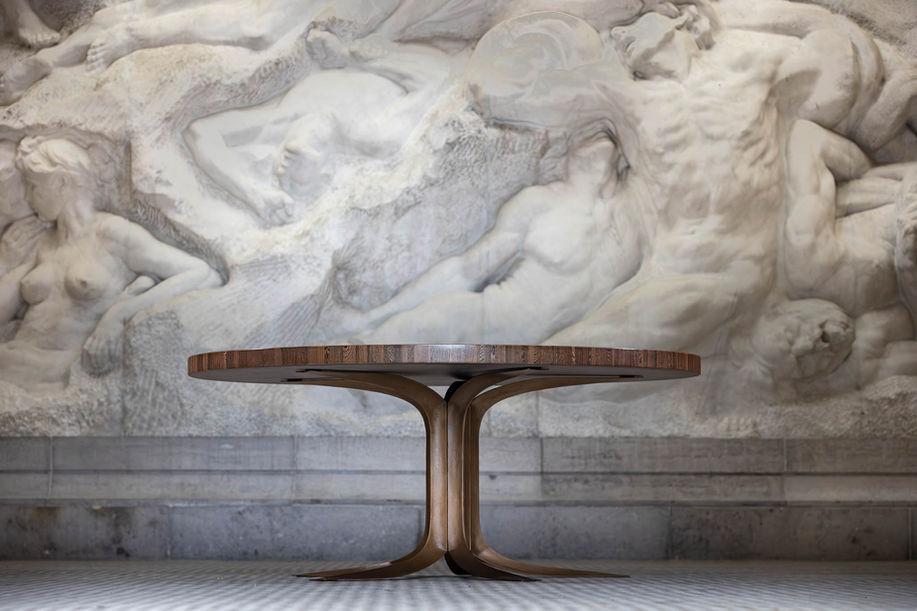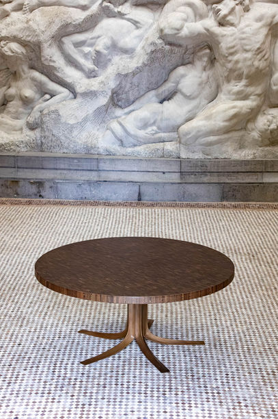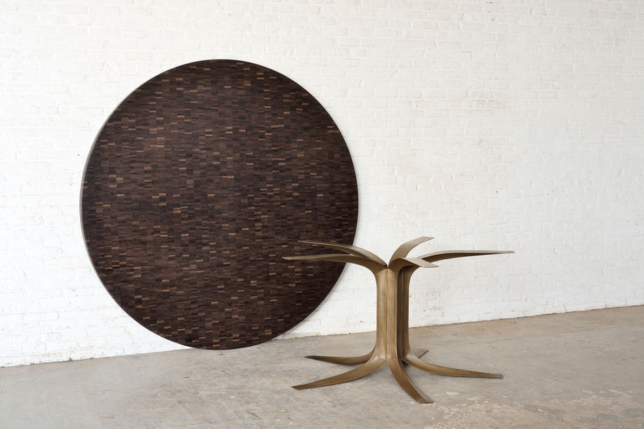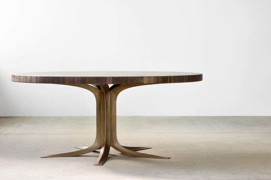 The round table was one of Jules Wabbes’ favorite creations. It was specifically designed for the house of a private client in Antwerp in 1966. The thick table top is made of rectangular blocks of wenge (Millettia laurentii) glued together to form an end grain board. The palette of dark brown is wonderfully warm, sober, and subtle. It was inspired by a traditional technique of wood joints utilised notably for butcher blocks. The stand is composed of five raw bronze cast elements screwed onto a central pentagonal shaft. Each element has a triangular, but curved, section whose three edges are polished, a subtle detail that lightens and emphasises the structure. A central table stand is most convenient, as none of your guests will experience the discomfort of being squeezed by an outside or lateral table leg. This table was conceived as a tribute to wood and metal.